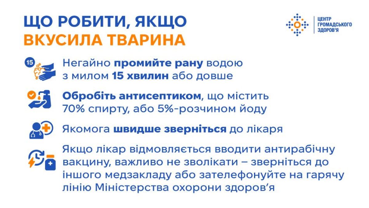 Якщо лікар відмовляється вводити антирабічну вакцину, важливо не зволікати — зверніться до іншого медзакладу або зателефонуйте на гарячу лінію Міністерства охорони здоров’я за номером 0 800 505 201. Перелік закладів, де проводять антирабічну вакцинацію, можна знайти за цим посиланням.